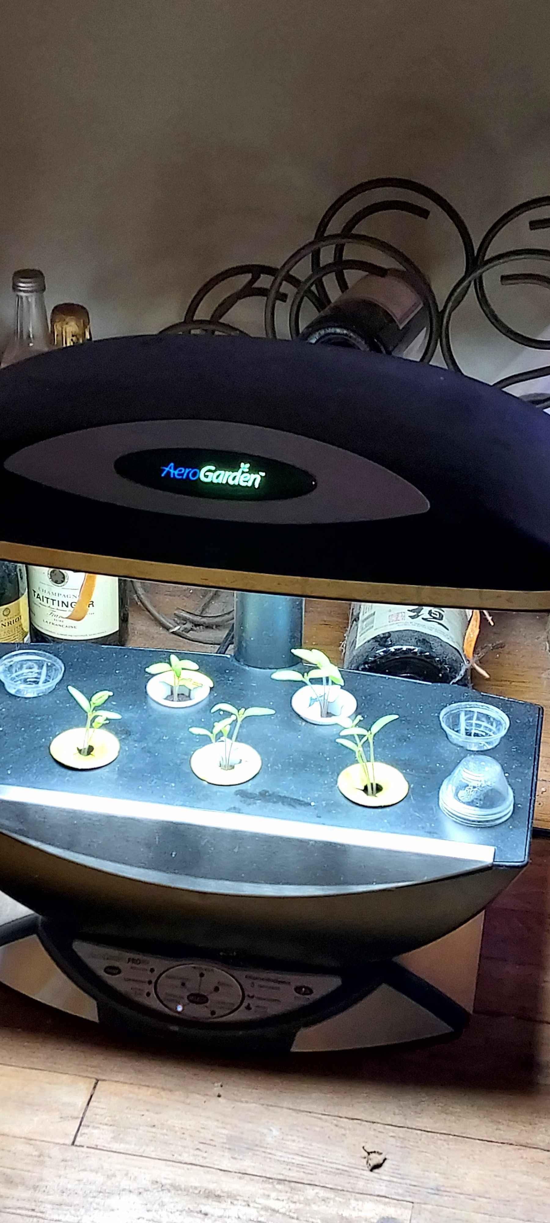 Below are the seed starts in Aerogardens. Bush cherry tomatoes, Cayenne Peppers, mesclun greens, sweet lettuce greens and a couple of Basil starts in pots.